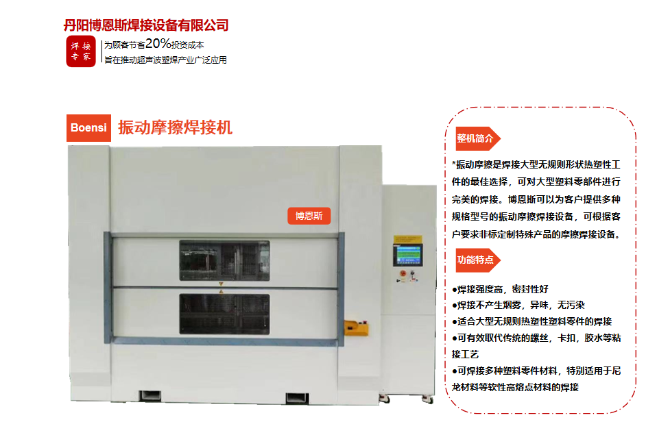 丹陽博恩斯焊接設備有限公司是塑料焊接領域集研發設計、生產制造、銷售服務為一體的企業。公司自成立以來堅持“以人為本”的理念,組織了一支強大的技術研發團隊,攜多年來積累的豐富經驗,并結合國際先進塑料焊接技術,根據市場需要,不斷開發具有核心競爭力的新產品。公司具有很強的非標機械研發、設計、生產能力,可為廣大客戶定制各類專用機械設備。公司設計生產的塑料焊接設備已廣泛應用于汽車、電子、家電、醫療器械、無紡布...